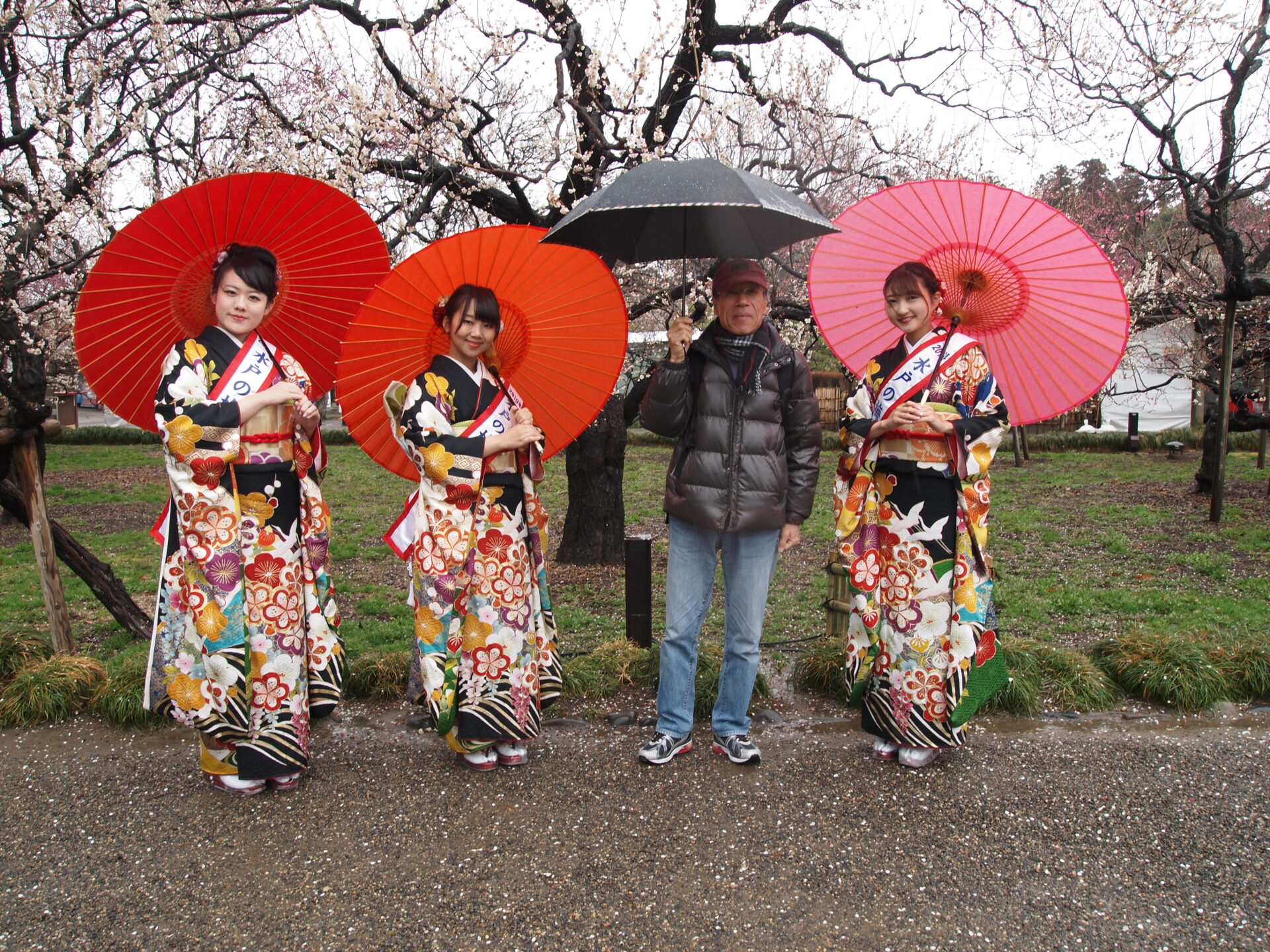 水戸の梅大使に出迎えていただきました。小雨模様で赤色や桃色の傘が映えてよりあでやか。