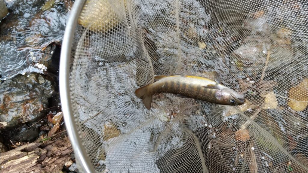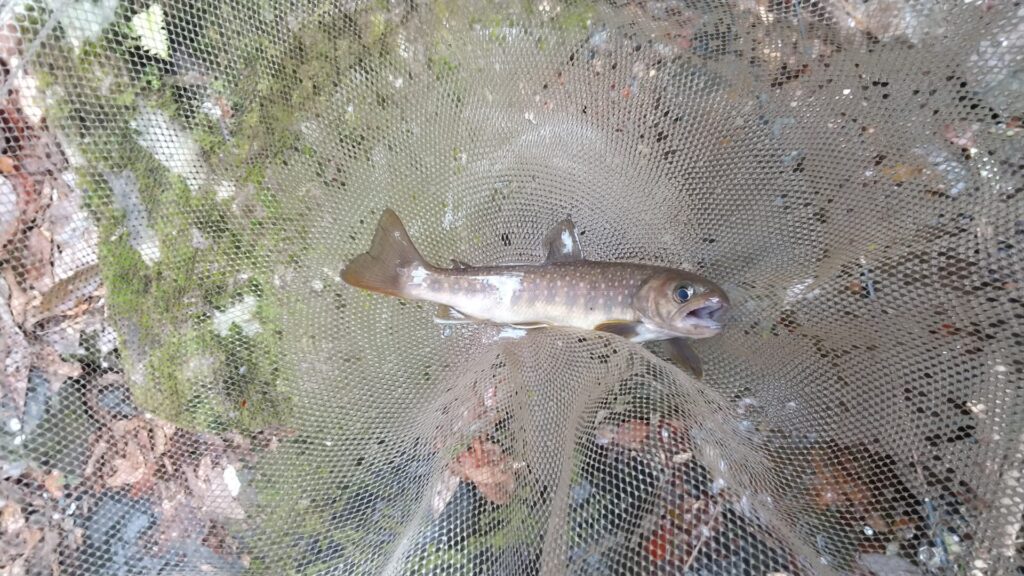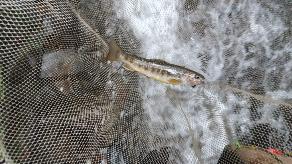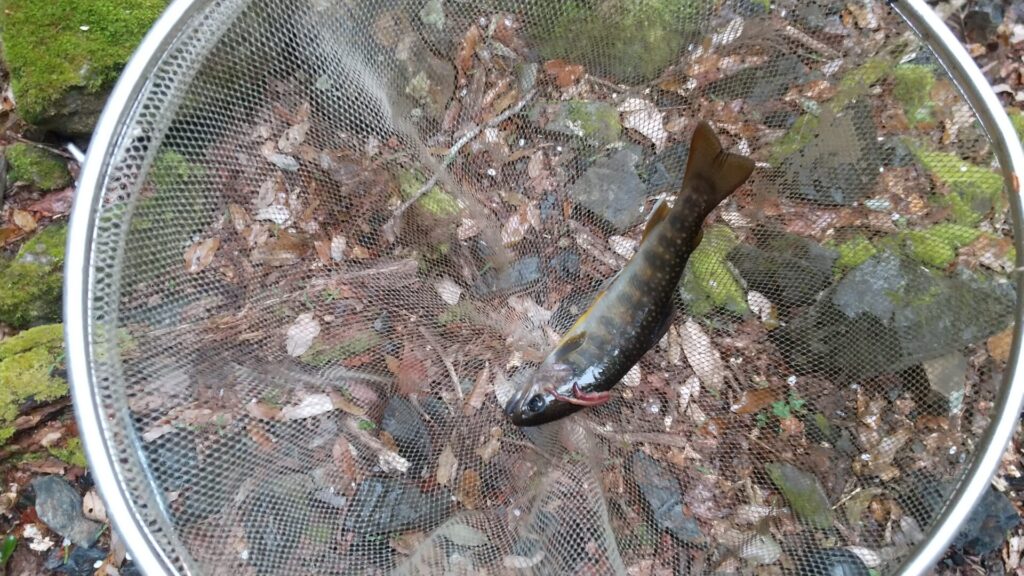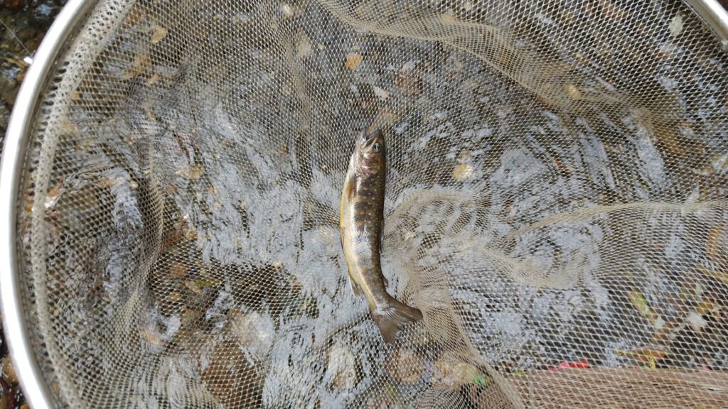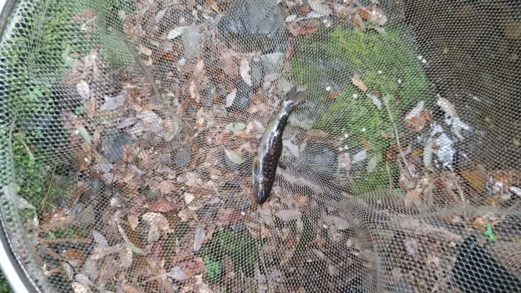 黒川虫には小物ばかり反応、食いは浅くバラシ2回、アタリがなくなってからオモリを重くしても反応なし、ミミズに変えても反応なく、誘いをかけたらツンツン反応するもアタリなし。 カワゲラに換えて流すと一発でガバーッと20cmが食いついてきた。