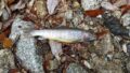 入渓してすぐの堰堤下は水量が少ない。 クロカワムシとミミズの餌を使ってみたが、タカハヤが掛かったのですぐに釣行を終了した。