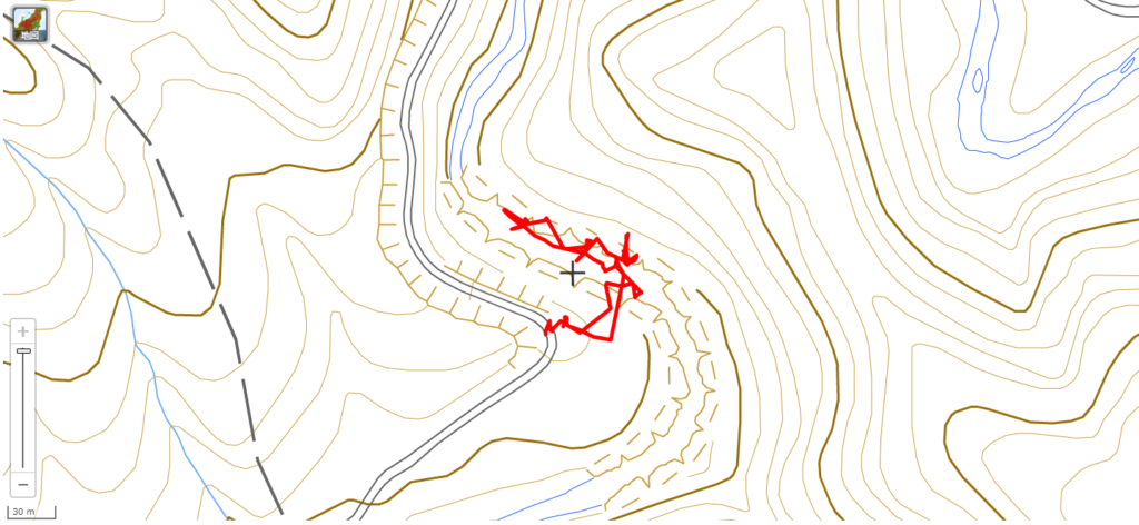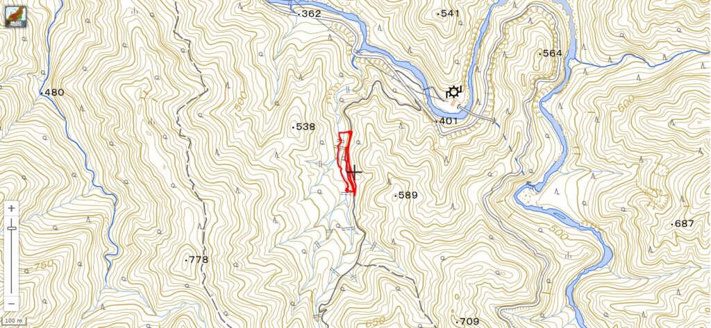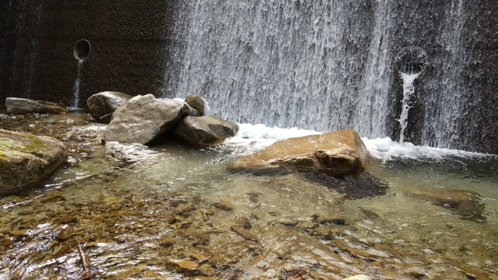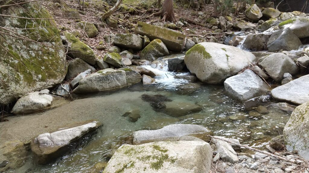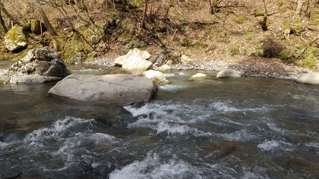 泥んこになった車を洗うのも面倒だという気持ちもあり、風越谷に入ることにした。駐車スペースから上流側林道途中まで車を進めても誰も入渓していないようなので、駐車スペースにもどり入渓準備をする。 この谷は堰堤が続き堰堤からの流出部分がポイントになり効率的な釣りができる。