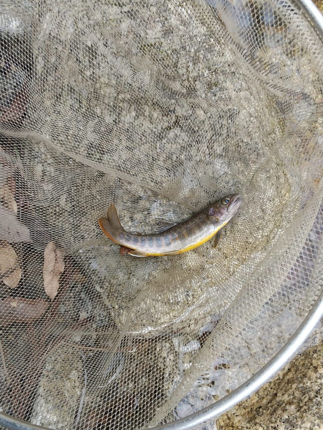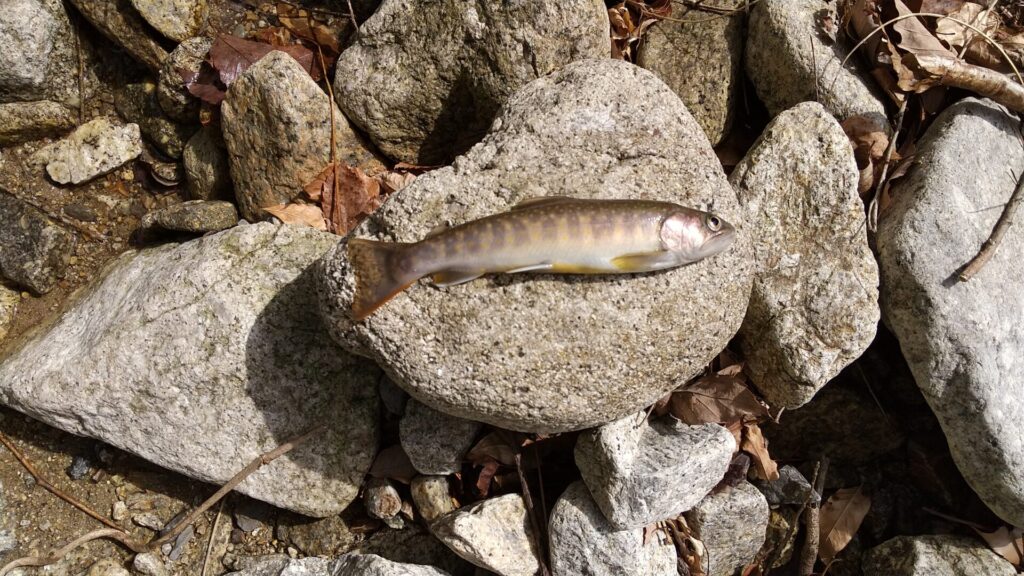 駐車点から谷まで降りた所で仕掛けを準備して最初の堰堤まで向かう途中で流れ込みから開けた良さそうな場所が目に入ったので早速カワゲラを付けて白泡めがけて第一投を流す。白泡が消えて黒く見える沈み岩の辺りで目印の速度が遅くなってくる。当たりの感触はないが合わせてみると早速掛かっている。15cmのイワナで針は口に掛かっている。