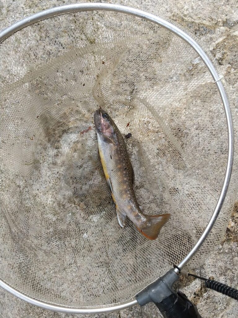 なかなか反応が出ないので、2B錘を追加して岩と岩の間の白泡に投入して流れに任せていると掛かった。餌はカワゲラで針は口に掛かっている。 19cm イワナをリリース。