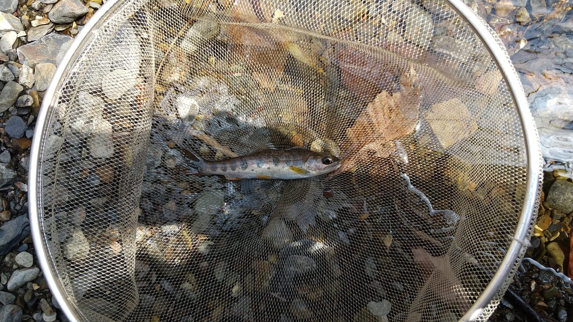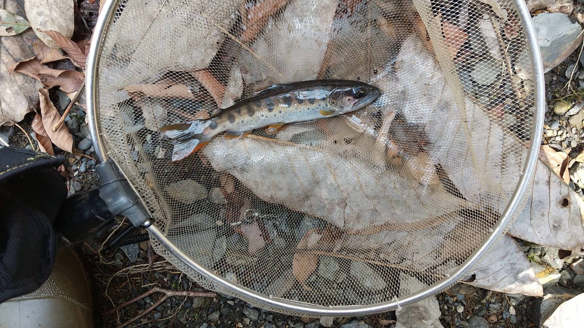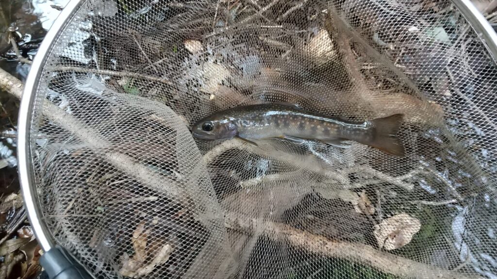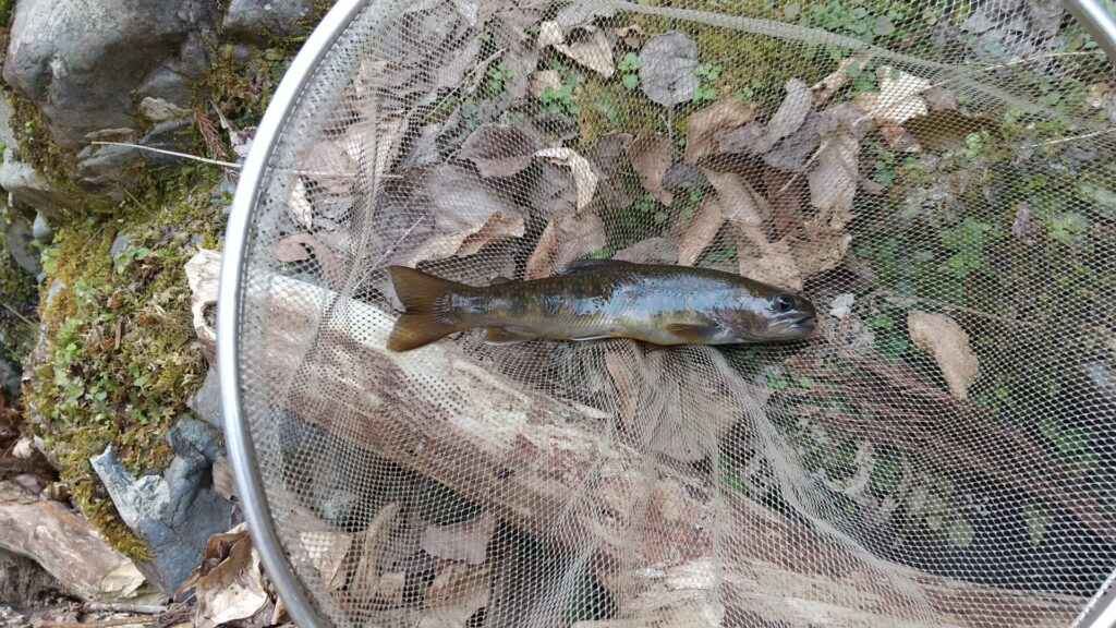 気を取り直してカワゲラの餌を付けて何回か投入するとヒット。19.5cm キープサイズにわずかに足らないイワナを掛けることができた。