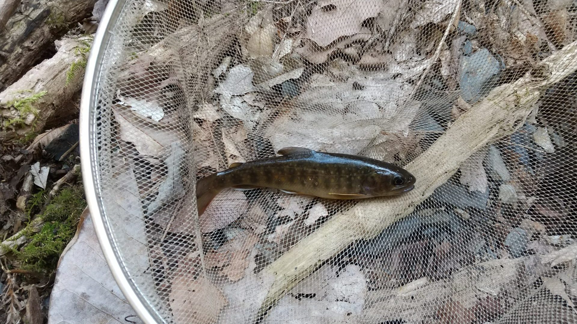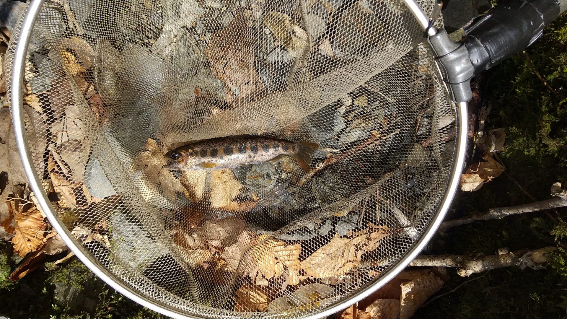 奥の方の少しだけ開けたところにカワゲラをつけて何回か投入を繰り返すと当たりがあり。水面の浮き枝に気をつけながら引き抜こうとしたらハリス切れでばらした。0.2 号ハリスは切れてしまう。